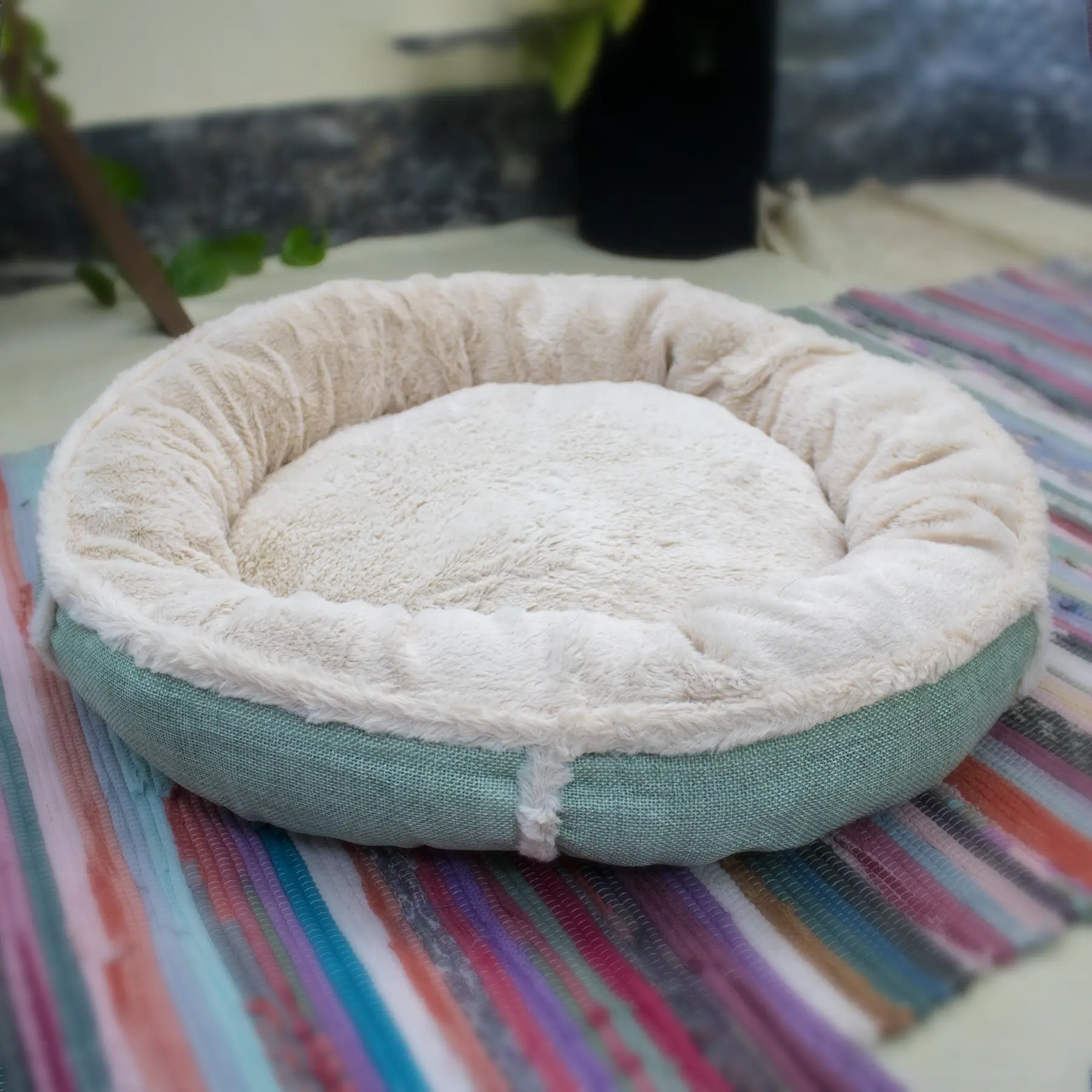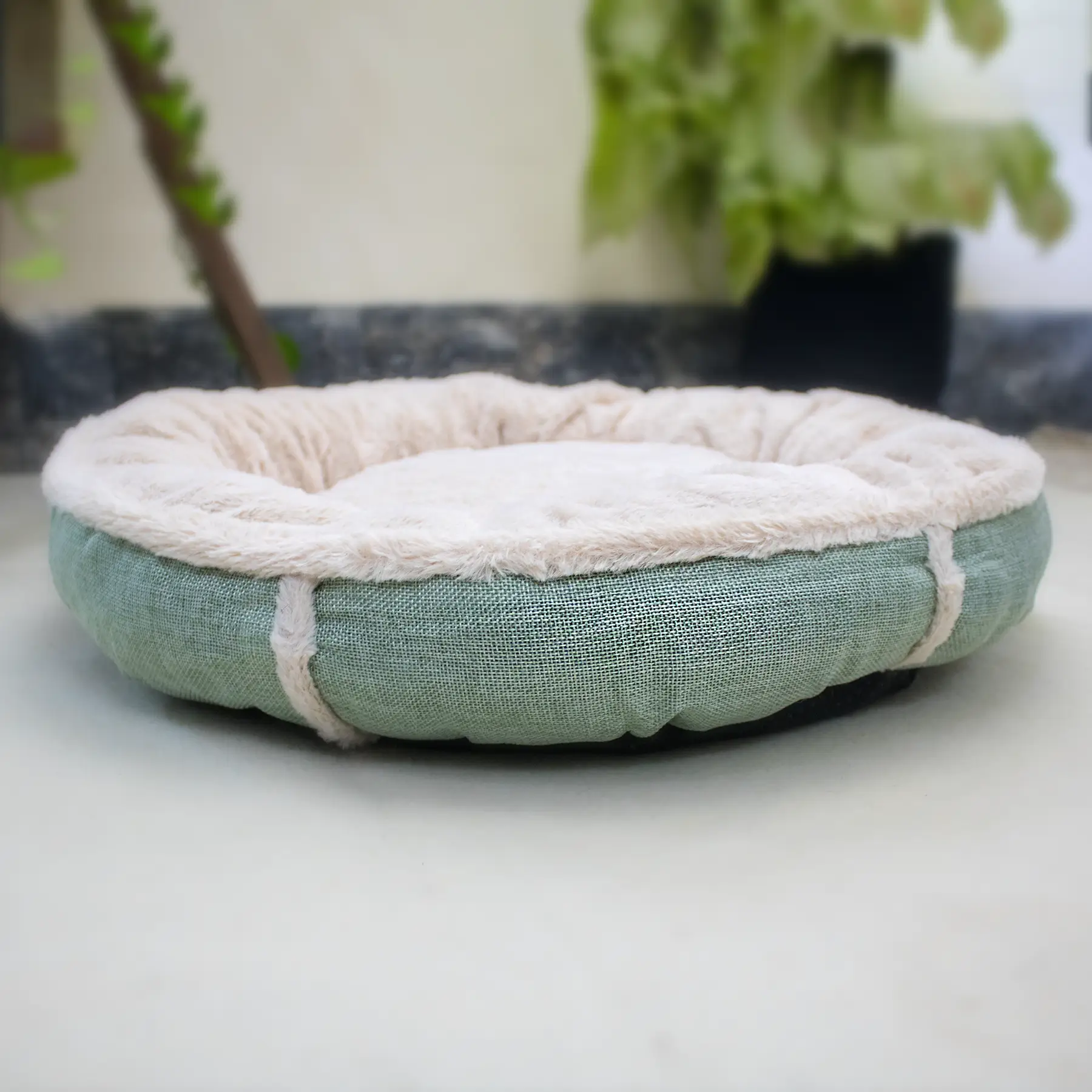 The bed features a durable anti-slip base, ensuring it stays firmly in place on tiled or wooden floors, even when your pet moves around. Finished with a textured pista-shade exterior, it brings a fresh, modern look that blends beautifully with indoor spaces. Easy to place and simple to maintain, this bed combines comfort, stability, and style, making it a perfect everyday resting choice for pets who love soft textures and cozy spaces.